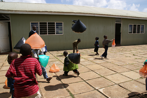 東明がペンテコスタル教会にて子どもたちと一緒に、ナイロビで見つけたゴミ袋とカーテンから創作したパラシュート作品を飛ばした。