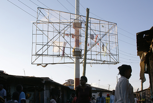 松原慈がケニア人アーティストOtieno Kotaとのコラボレーションで、キベラ地区の巨大な広告塔に白い布をつり下げ、キベラの日常を映した写真を投影した。