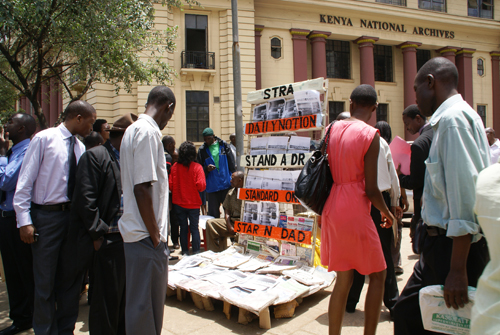 松原慈がナイロビで体験した個人的な思い出にもとづいて、既存の新聞を作り替えて印刷し直し、道ばたの新聞スタンドで新聞売りのように販売した。
